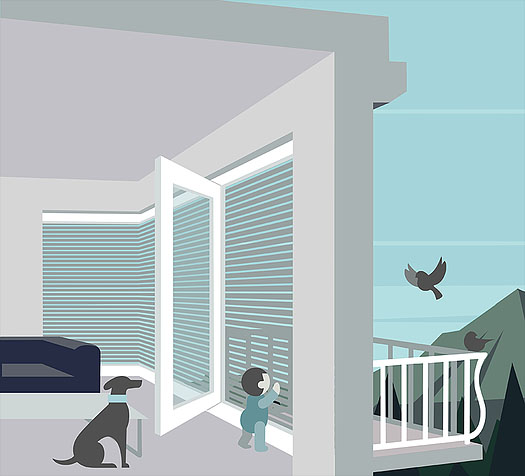 Le volet roulant d’angle protège des intempéries et du soleil tout en assurant une protection thermique nocturne et hivernale sans que la vue soit limitée par les guides d’angle lorsque le volet roulant est levé.